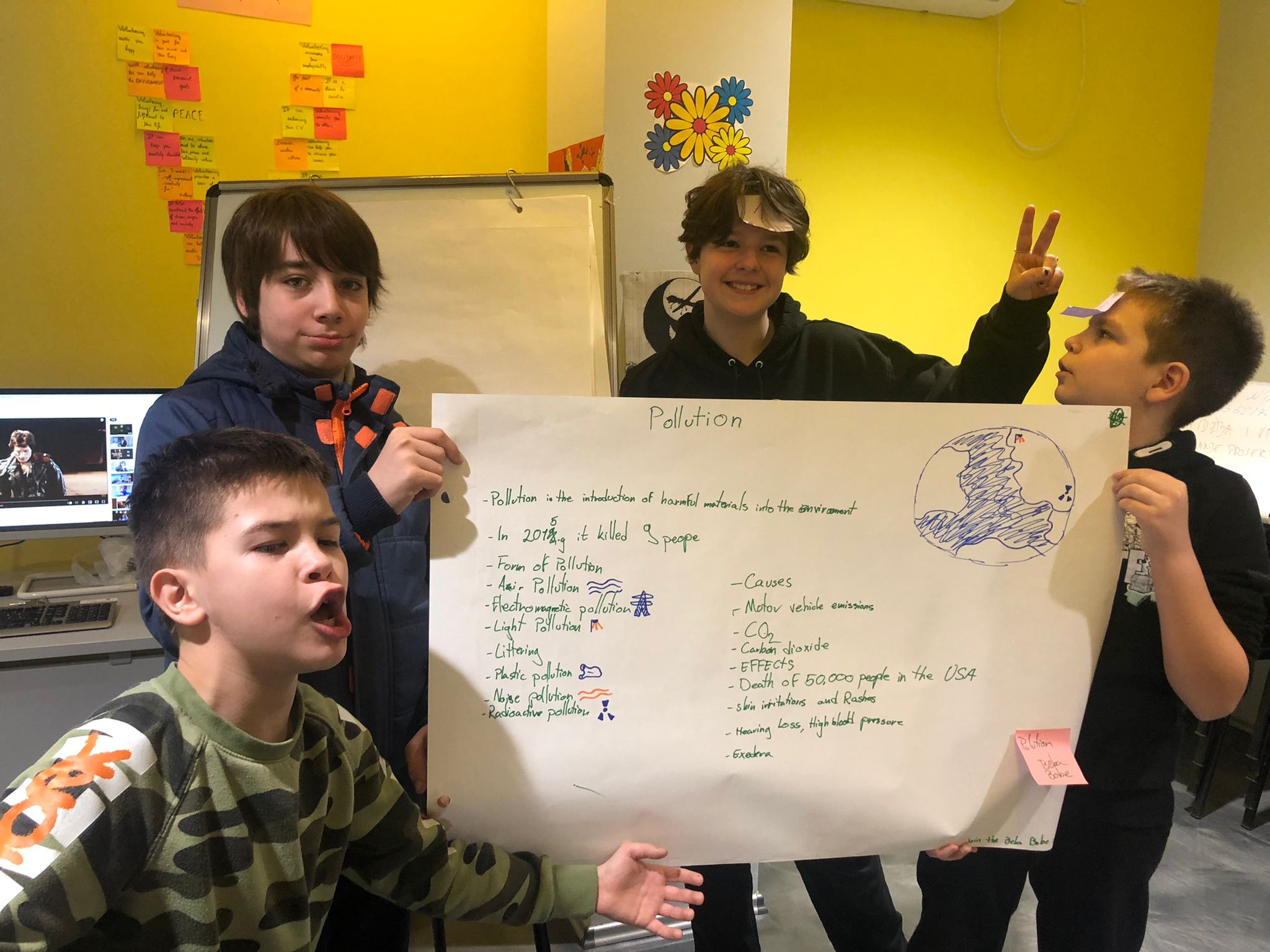 They answered this question “What is the biggest ecological problem in your opinion ?”. After a debate in each team, they identified pollution, and other problems… then made a presentation in front of the volunteers.
