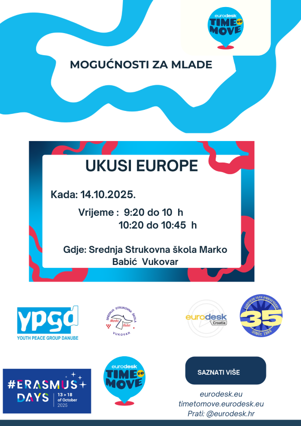 14.10.2025 se družimo sa srednjoškolcima u Srednjoj strukovnoj školi Marko Babić u Vukovaru uz interaktivnu radionicu „Ukusi Europe”, u sklopu Time to Move kampanje i obilježavanja Erasmus Days 2025! 🎉
