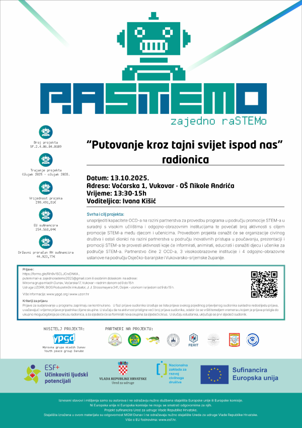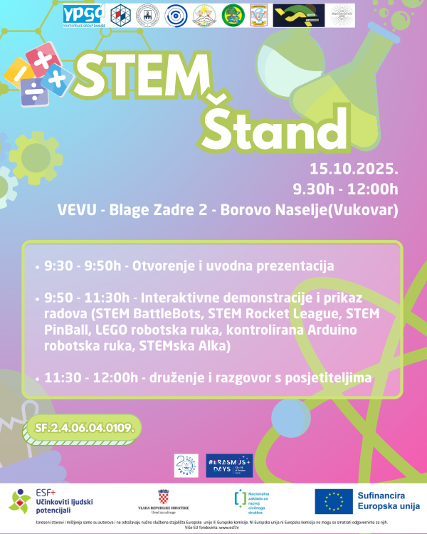 I dok su STEM radionice za djecu i mlade u Vukovaru i Osijeku u tijeku u okviru projekta "Zajedno raSTEMo", mi nastavljamo s promocijom naših STEM aktivnosti i najavljemo naš STEM štand u okviru javnog događanja. Pozivamo Vas: