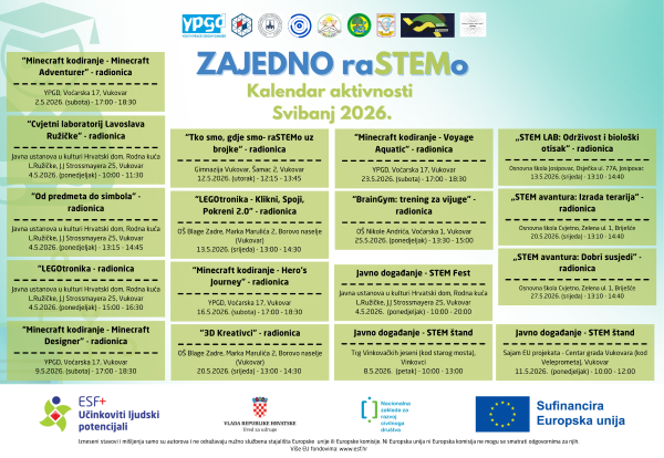 Travanj 2026. započinjemo novim aktivnostima u okviru projekta "Zajedno raSTEMo"! Vaša je briga prijaviti i dovesti djecu, a naša približiti im STEM 😀 I ovaj mjesec čekamo Vas u Vukovaru, Osijeku, Josipovcu i Negoslavcima!
