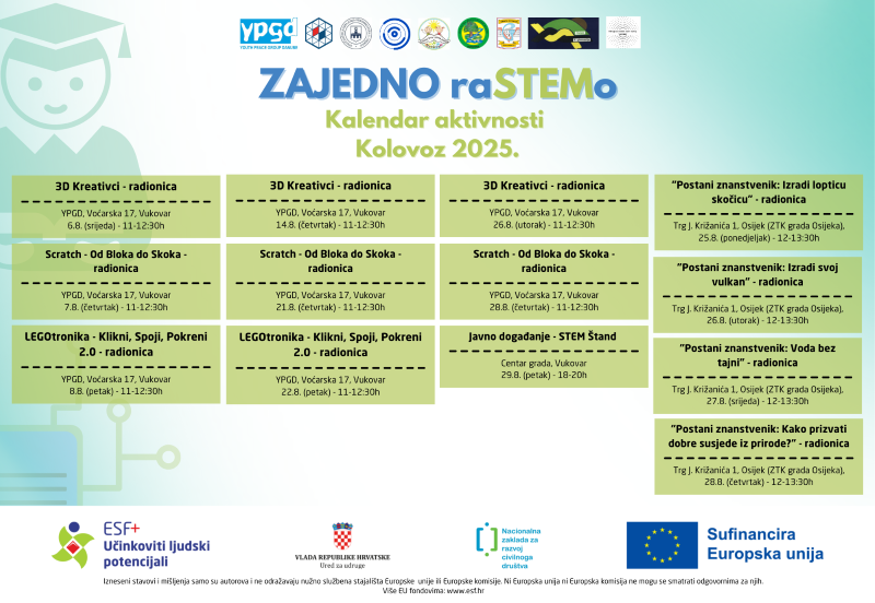 Nastavljamo u STEM tonu i u KOLOVOZ uz novi kalendar aktivnosti u okviru projekta "Zajedno raSTEMo"! Vaša je briga prijaviti i dovesti djecu, a naša približiti im i učiniti ljeto zabavnim uz STEM 😀 Vukovar i Osijek su spremni!!!!